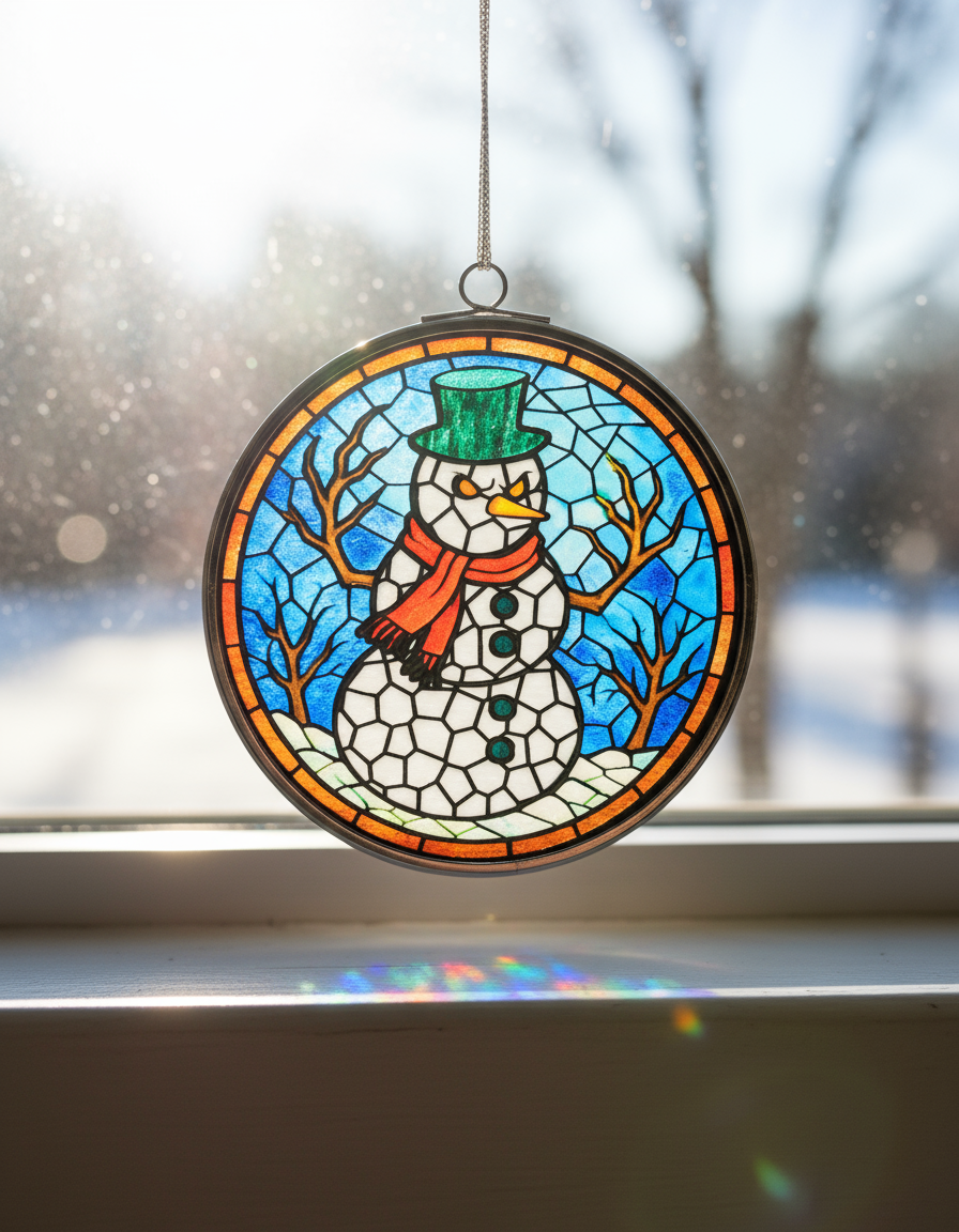 This snowman’s got more bite than chill. Frosty Glow captures the eerie calm of a frozen night, with a sinister snowman staring through a forest of bare trees, his carrot nose and coal eyes lit with mischief. The layered printed glass gives the icy blues and fiery accents an almost living energy — turning any bit of winter light into a haunting holiday glow.