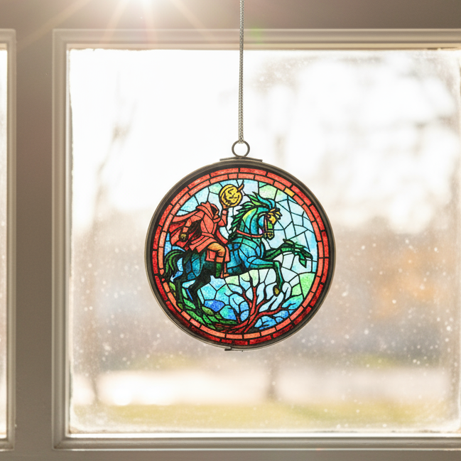 No head. No mercy. Just pure Halloween legend. Headless Horseman captures the eerie motion of Sleepy Hollow’s most famous rider, his pumpkin lantern blazing as his spectral steed rears beneath a blood-red sky. The layered glass printing gives depth to the glowing jack-o’-lantern and ghostly blues — like a haunted story brought to light every time the sun hits your window.