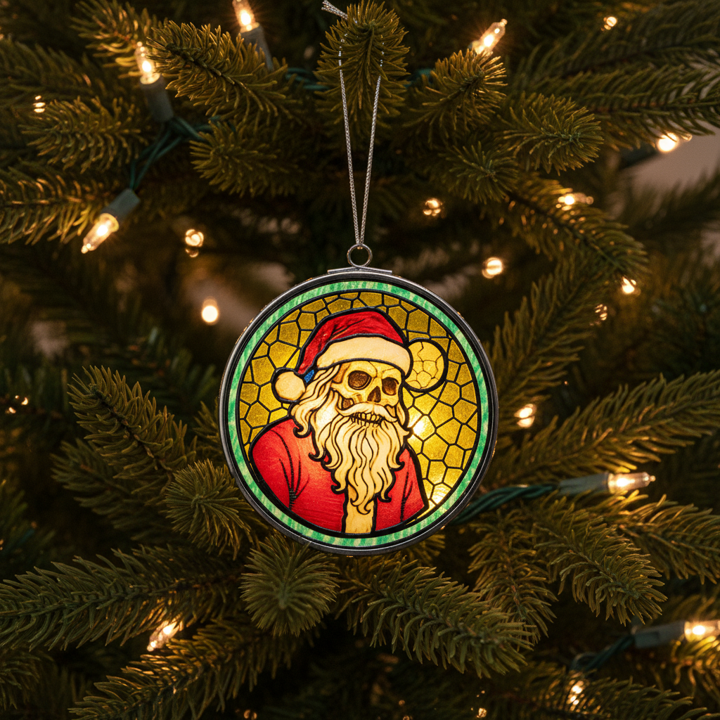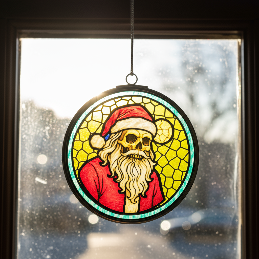 He sees you when you’re sleeping… and he’s been dead for a while. Skelly Claus brings twisted holiday cheer to your window, featuring a jolly skeleton Santa glowing in festive red and bone-white under a ghostly full moon. The layered printed glass gives him haunting depth, so when the light hits, it’s equal parts Christmas magic and graveyard chill.