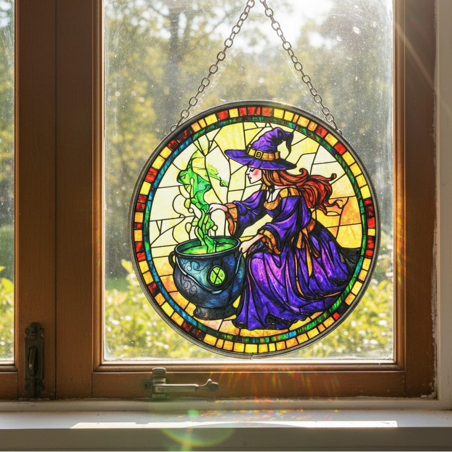 Something wicked, and wonderful — is brewing. The Enchantress’s Brew glows with rich purples, fiery golds, and an eerie green mist swirling from a bubbling cauldron. The layered printed glass gives the illusion of motion and magic, as if the potion itself flickers to life when light shines through. A spellbinding addition to any window, best admired by candlelight or moonlight.